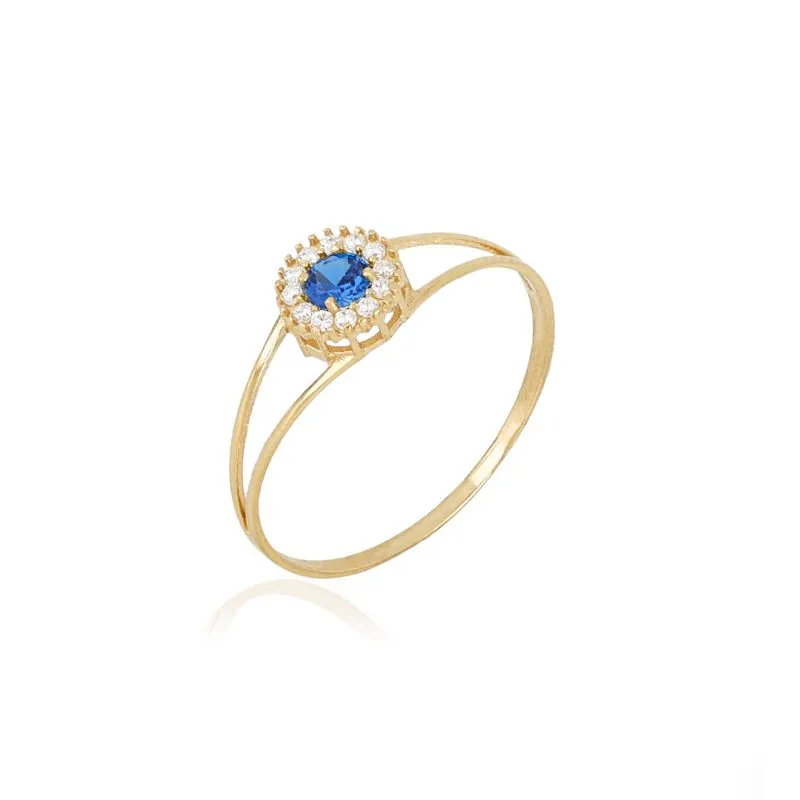 Anel chuveiro de ouro amarelo 18k redondo com dois aros, pedra central zircônia azul e zircònias brancas ao redor.