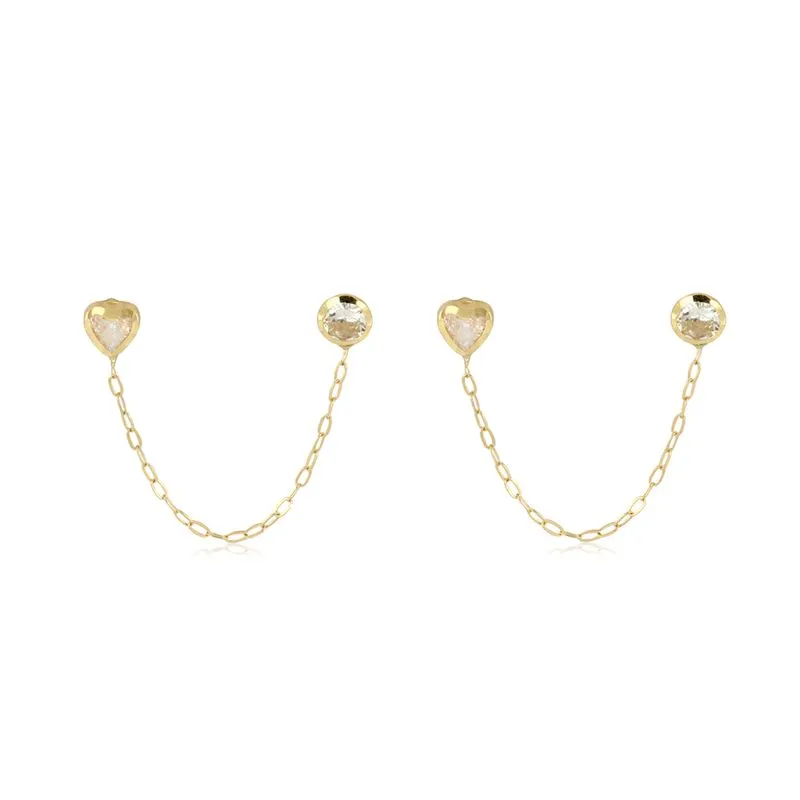 Brincos 2 furos de ouro amarelo 18k de coração e círculo com tarraxa padrão e baby para o segundo furo com zircônias brancas, corrente de veneziana longa,