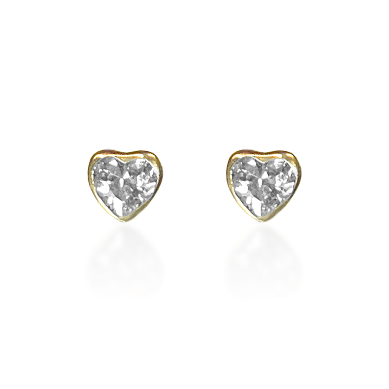 Brincos Infantil de Ouro Amarelo 18k em formato de coração com zircônias brancas e tarraxa baby press.