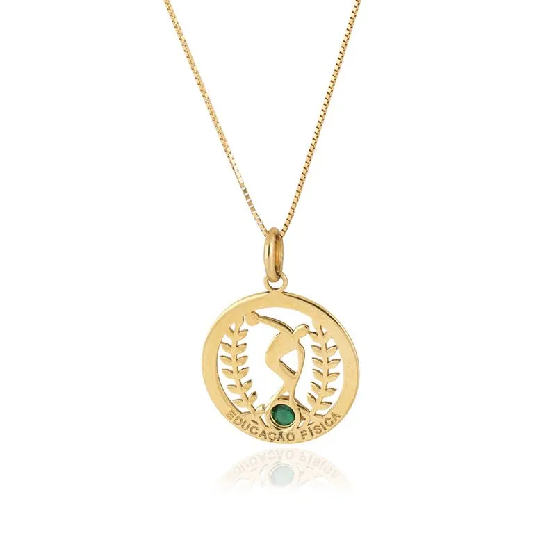 Pingente de formatura / graduação de educação física redondo de ouro amarelo 18k vazado com zircônia verde.
