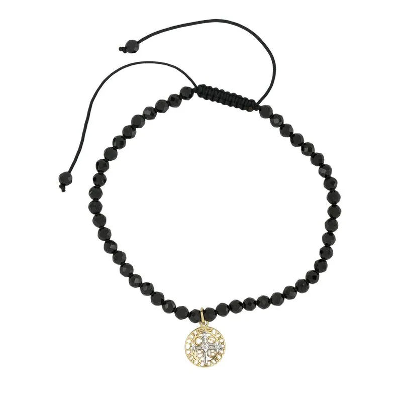 Pulseira Shambala São Bento ajustável com pedra brasileira espinélo, fio de seda preta e pingente de São Bento redondo de ouro amarelo 18k vazado com detalhe em aplique de ródio branco.